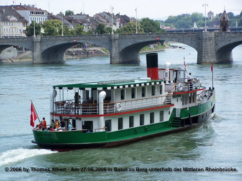 Weitere Fotos: "BASLERDYBLI" (1980) - Steuerbordseite, kurz nach Ablegen von der Schiffslände in Basel. Interessant ist, dass der Schornstein (Kamin) zur Seite geklappt wird. Thomas Albert