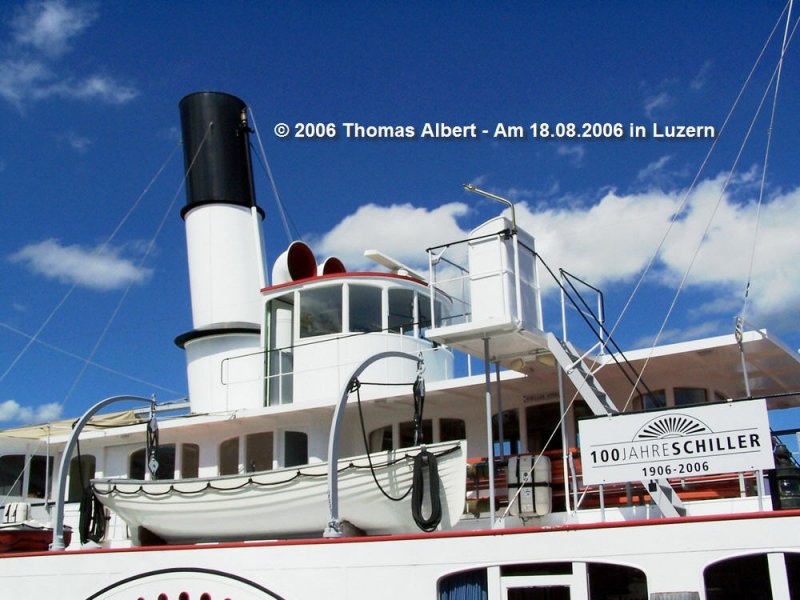 Name: "SCHILLER" / Baujahr: 1906 (Stapellauf 17.02.1906 , Indienststellung 21.05.1906 / Bauwerft: Gebrüder Sulzer in Winterthur (Schweiz) / Flagge: Schweiz / Länge: 63,00 m über alles , 60,00 m über Perpendikel / Breite: 7,20 m auf Hauptspant , 14,30 m über Radkasten / Tiefgang: 1,24 m (leer) , 1,47 m (beladen) / 900 Passagiere (1000 Passagiere bei Indienststellung) / Antrieb: Dampfmaschine (Schrägliegende 2-Zyl.-Heißdampf-Verbundmaschine) mit 700 PSi / Eigner ~ Betreiber: Schifffahrtsgesellschaft des Vierwaldstättersees (SGV) in Luzern / Heimathafen: Luzern / Fahrtgebiet: Vierwaldstättersee / Schiffs- oder Registriernummer: ? / Bemerkung: Um 1920 wird ein Steuerhaus aufgebaut. 1951-52 Umbau von Kohle- auf Schwerölfeuerung. Oktober 1997 bis März 2000 Generalsanierung des ganzen Schiffes. Thomas Albert
